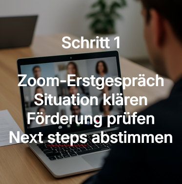 Alle Gespräche finden persönlich per Zoom statt. Sie sprechen dabei immer direkt mit einem unserer BAFA-gelisteten Berater. Persönlich, individuell und lösungsorientiert. Keine anonyme Plattform, keine Standardlösungen, sondern eine individuelle Beratung, die exakt zu Ihrem Unternehmen passt.
